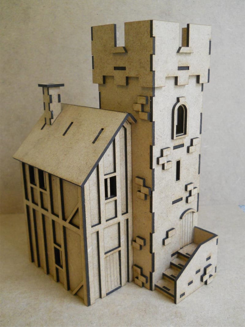 A four storey laser cut building supplied as a kit and also a card roof tile pack, overall height is 180mm, width 102mm, length 129mm. Has a removable tower top and roof. Scale is good for 28mm - 34mm miniatures, for fantasy or Medieval/Old Europe.