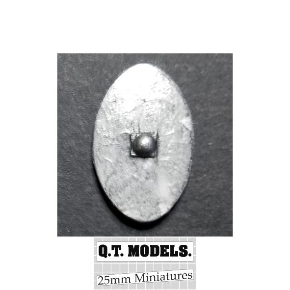 A pack of ten white metal shields suitable for 25mm miniatures.