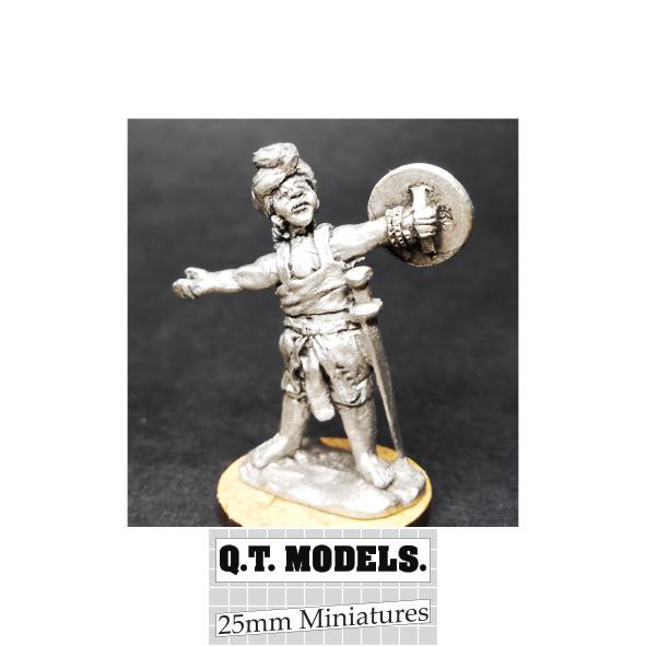 A white metal 25mm miniature supplied with open right hand for wire javelin-not supplied.