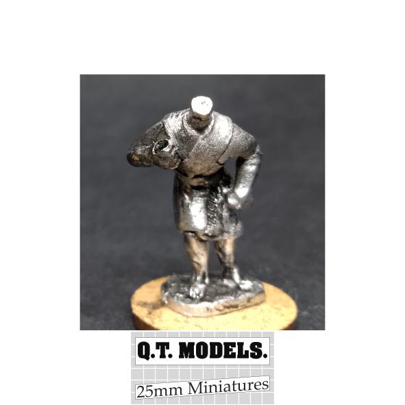 A white metal 25mm miniature. Drilled right hand for wire spear. Recommended head-P08 Helmet. Recommended spear-please supply own wire.